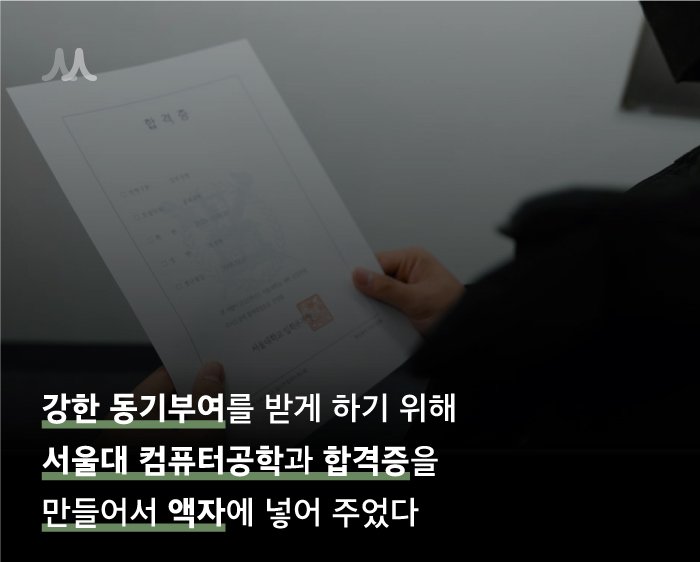 이후 아이는 컴퓨터 공학과 선생님과 함께 멘토링을 하면 안되겠냐고 물었고, 주1회 합류하게 되었다. 그러더니 공부에 집중하는 모습이 너무나 많아지기 시작했다. 그렇게 늦잠자고 시간에 늦던 아이가 아침에 일어나 먼저 책상을 준비하고, 공부습관 멘토 선생님드릴 물 한잔과 과일을 준비하는 아이로 바뀌어 갔다. 강한 동기부여를 받게 하기 위해 서울대 컴퓨터공학과 합격증을 만들어서 액자에 넣어 주었다.