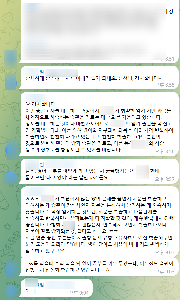 “어머님께 걸려온 전화, 정말 감사드립니다. 어머님, 기말고사에는 모든 과목 1등급 받을 수 있도록 만들어 놓겠습니다.”