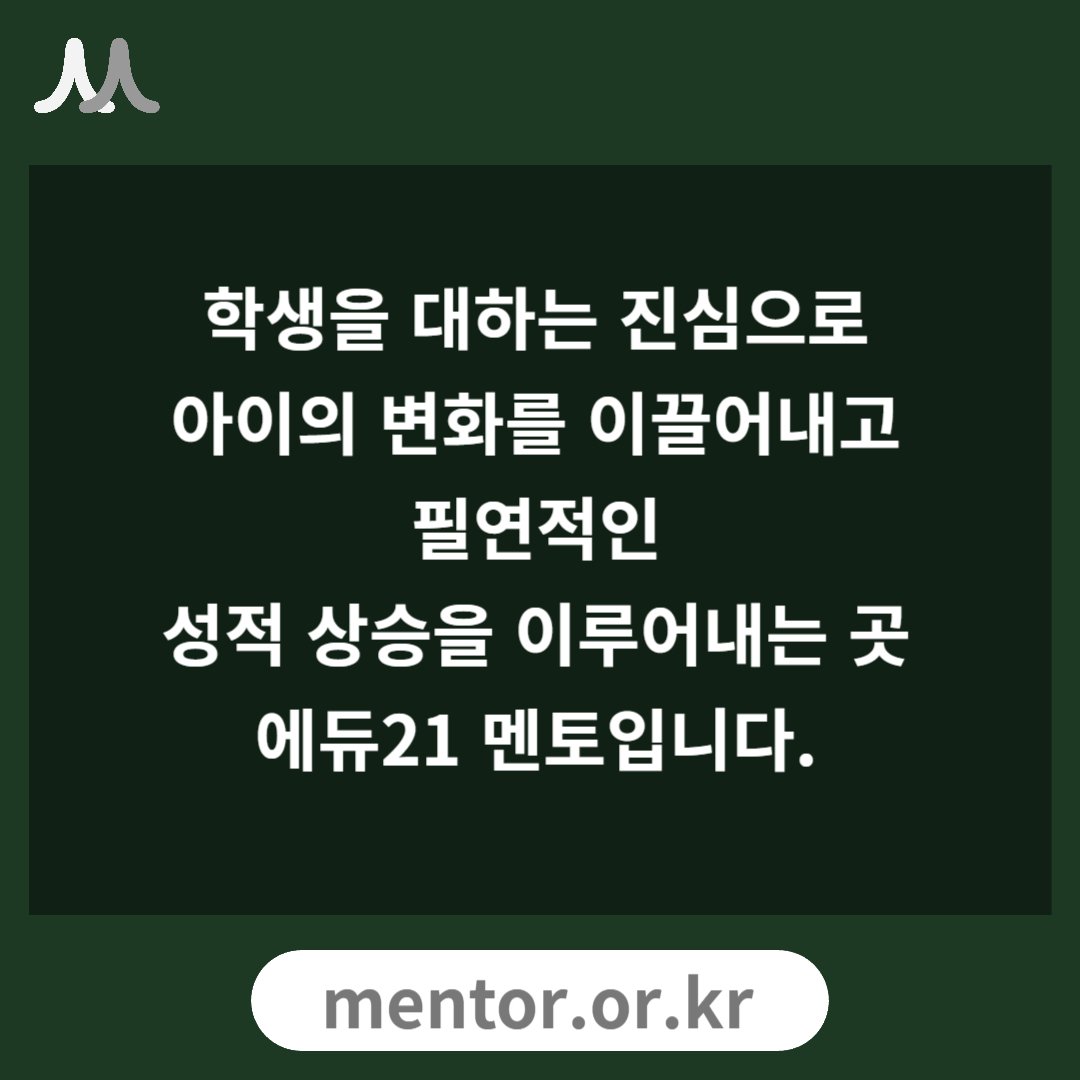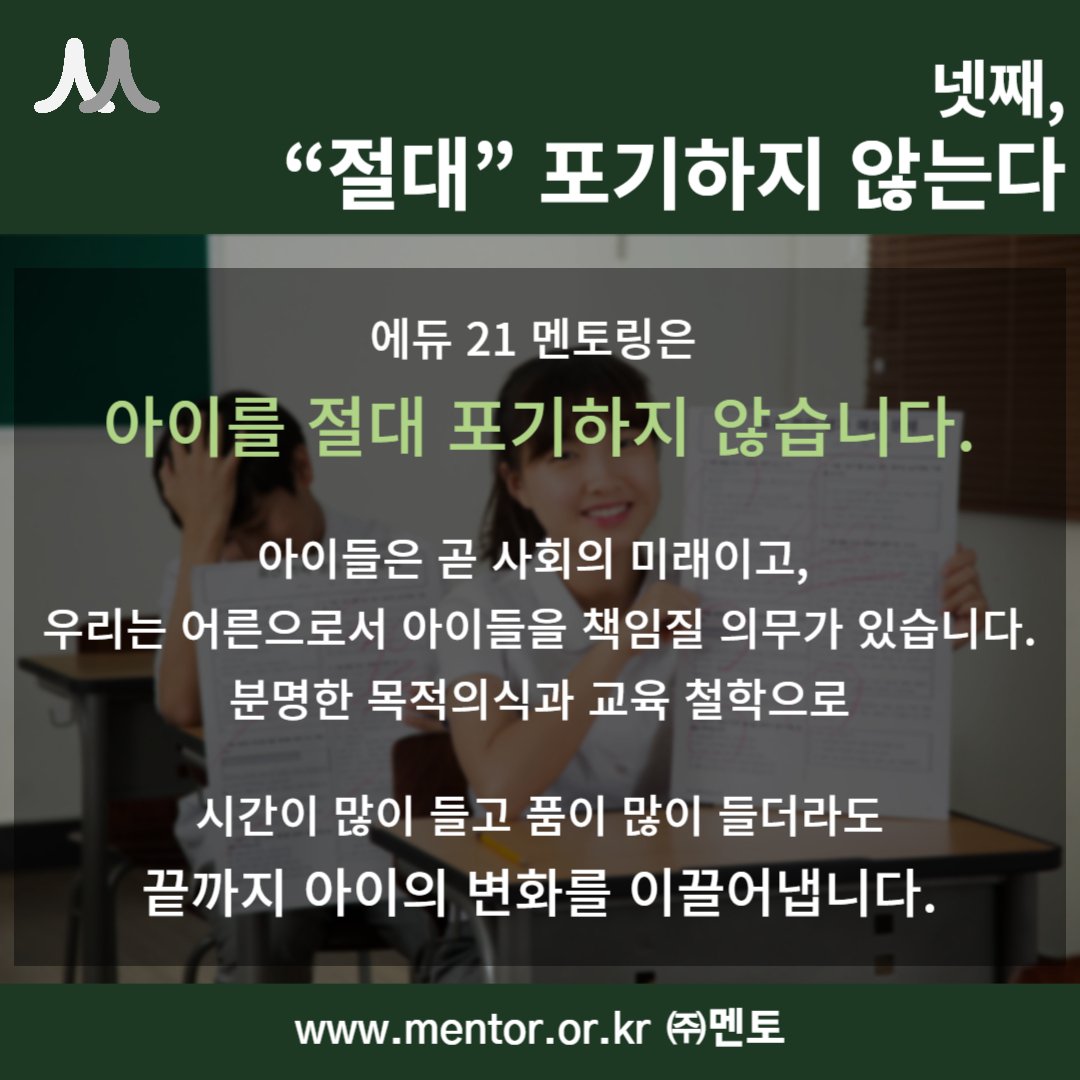 그러나 저희 에듀21 멘토링은 아이를 절대 포기하지 않습니다. 왜냐하면, 아이들은 곧 사회의 미래이고, 우리는 어른으로서 아이들을 책임질 의무가 있다고 믿기 때문입니다. 갑자기 사명감 같은 고루한 이야기를 한다고 느낄 수도 있겠지만, 위와 같은 세심한 관리를 위해서는 분명한 목적의식과 교육철학을 가지고 있어야 합니다. 저희는 소위 대형 학원과 같이 레벨 테스트로 아이들을 줄세우고, 수준을 나누고, 낮은 점수를 받은 아이들을 ‘하급반’이라는 이름으로 수준미달이라고 낙인찍지 않습니다. 시험 점수가 어떻든, 현재 아이의 상태가 어떻든, 앞으로 변해갈 수 있고 또 변해갈 것이라고 기대하는 것이 교육의 대전제라고 저희는 믿습니다. 그래서 항상 겸손한 마음을 갖고, 아이에게 진심으로 다가가려 노력하고, 그 결과 아이를 바꾸어냅니다. 비록 시간이 많이 걸리고 품이 많이 드는 일일지라도 멘토는 학생을 절대로 포기하지 않습니다.