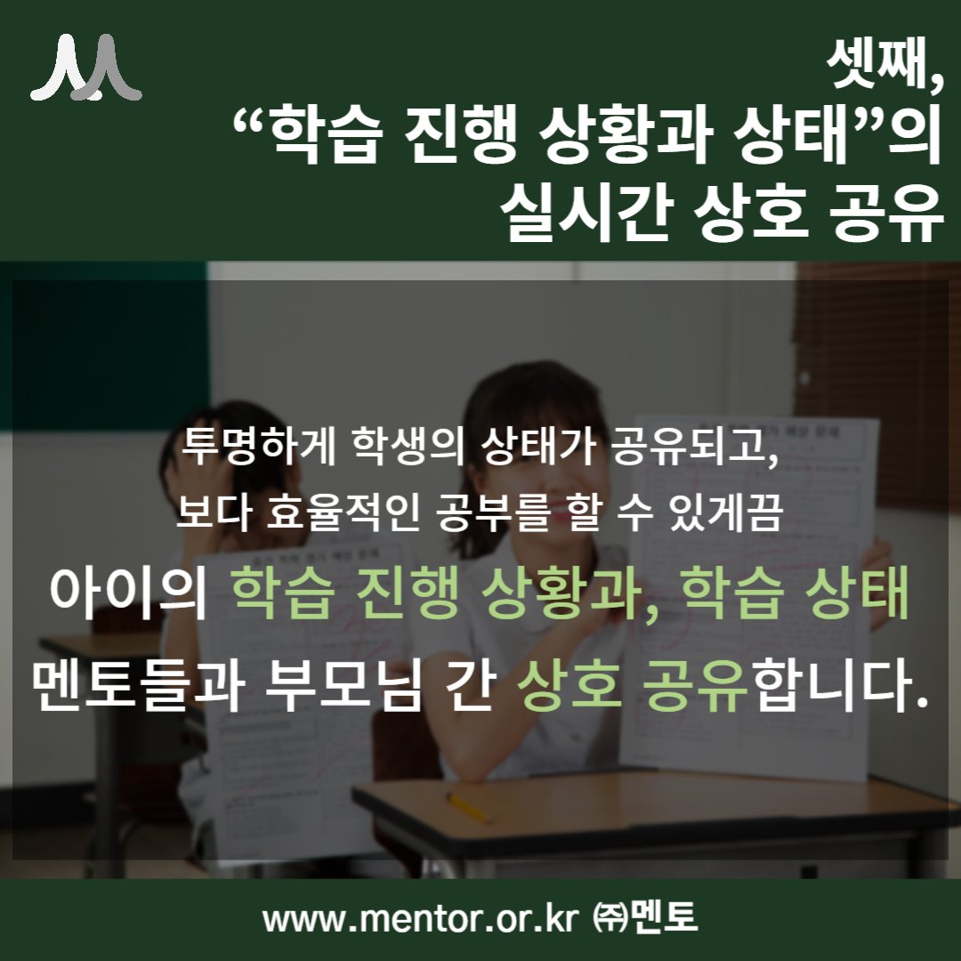 셋째, 멘토랑은 아이의 “학습 진행 상황과 학습 상태”를 실시간으로 상호 공유한다.