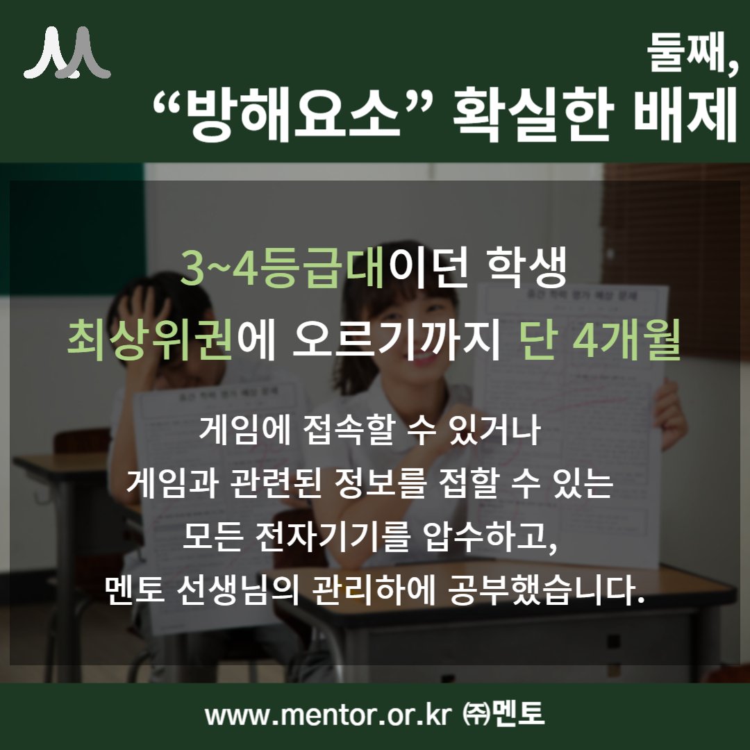 저희가 이 학생을 만나고 처음 한 것은 무엇이었을까요? 휴대폰, 노트북, 태블릿, 컴퓨터 등 게임에 접속할 수 있거나 게임과 관련된 정보를 접할 수 있는 모든 전자기기를 압수하고, 멘토 선생님의 관리 하에 공부하게끔 지도한 것입니다. 학생은 당연히 반발했습니다. 부모님과의 사이가 좋지 않은 편이던 S학생은 비난의 화살을 어머님께로 돌리기도 하였습니다. 그렇지만, 공부의 방해요소를 확실하게 배제하고 공부를 하게끔 몇 달간 지도한 결과, 학생의 중간고사 성적으로 결과가 나왔습니다. 거의 대부분의 과목에서 1등급에 준하는 성적을 받은 것이었습니다.