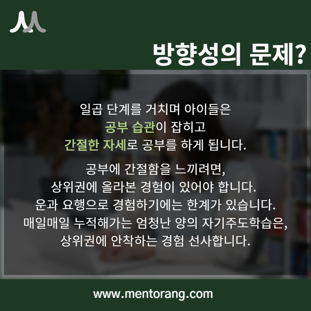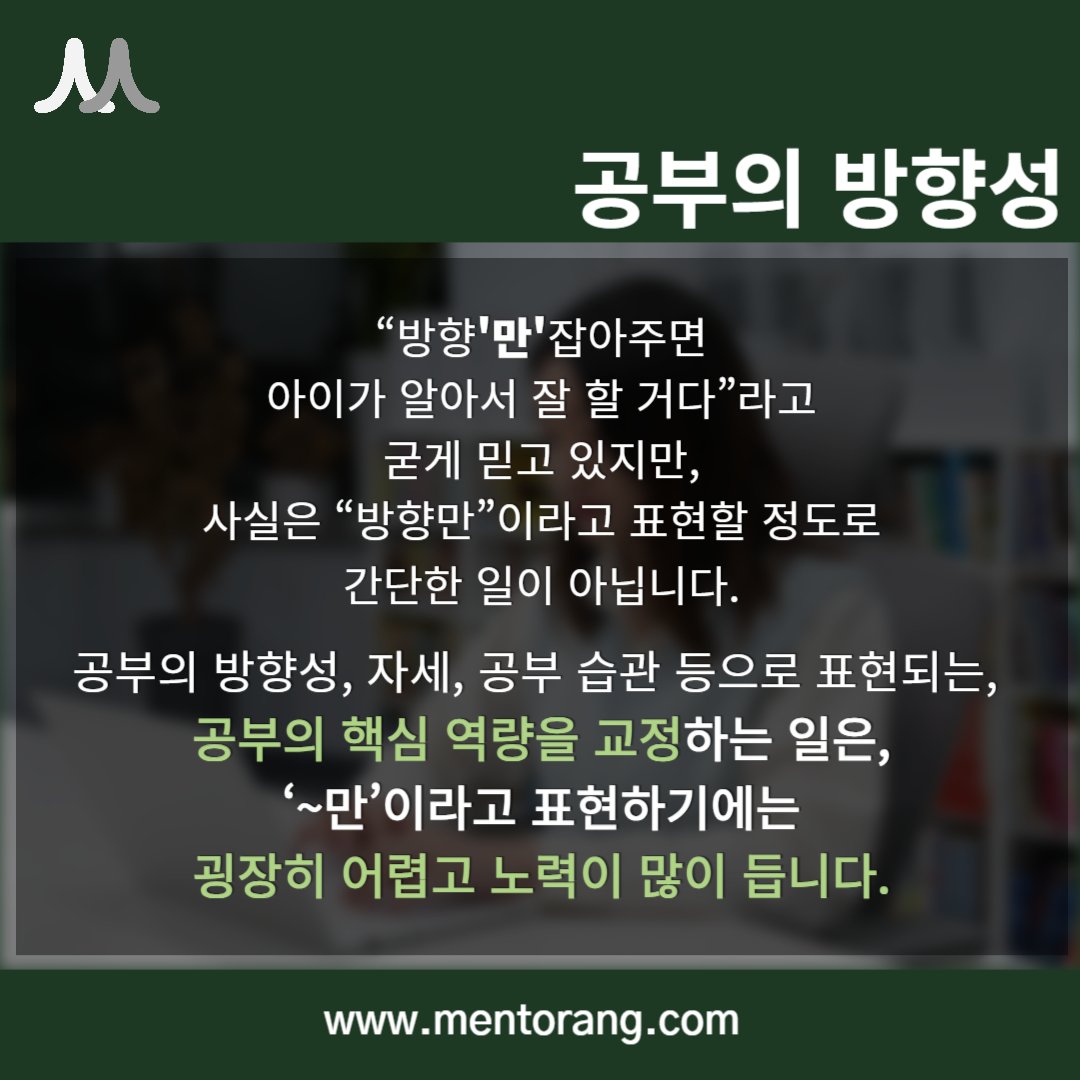아이들 학습 관리의 경험이 부족하신 어머님들이 공통적으로 하는 말, “방향성만 잡히면 좋을텐데..” 입니다. 그러나 이 말은 실상 아무 소용도 없습니다. 조금 철 지난 말로 표현하자면,
