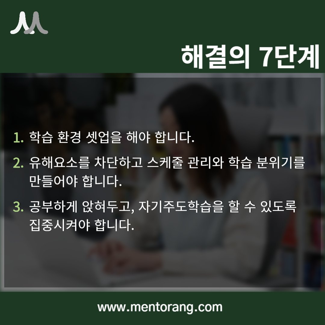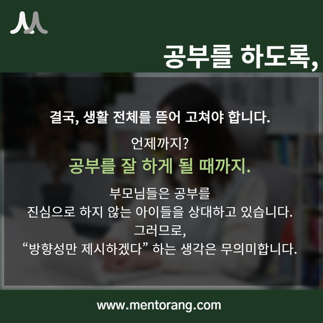 애초에 공부 습관을 만들고, 절실함을 갖고, 방향성을 잡는다고 알아서 그렇게 실천하는 학생이라면 골머리를 앓을 필요조차 없습니다. 부모님들은 공부를 진심으로 하지 않는 아이들을 상대하고 있습니다. 그러므로, “방향성만 제시하겠다” 하는 생각은 무의미합니다.