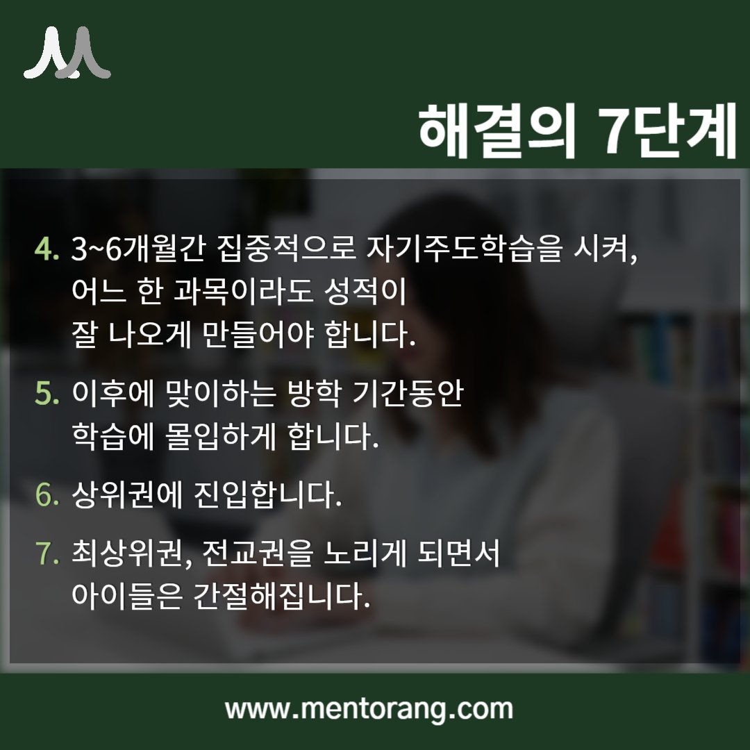 넷, 3~6개월간 집중적으로 자기주도학습을 시켜, 어느 한 과목이라도 성적이 잘 나오게 만들어야 합니다. 평소에 공부를 전혀 안하던 학생이더라도, 한 학기 정도 되는 기간동안 집중해서 공부를 해보면 성적이 오를 수밖에 없습니다. 학생 스스로 ‘하면 되는구나’하는 깨달음을 줘야 합니다. 물론 이렇게 길다면 긴 기간동안 매일 집중하여 공부시키는 것은 한 명의 조력자만으로는 어렵습니다. 여러 멘토 선생님들이 달라붙어 집중적으로 처음 3~6개월간을 관리합니다.